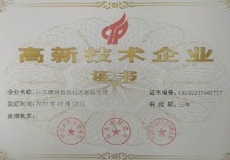 山東驟風信息技術有限公司,于2022年12月通過了高新技術企業認證!